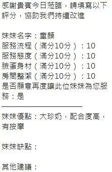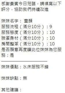 奶砲,按摩,共浴,LG(舌吻)依氣氛衛生而定,可親嘴,無套吹,口爆,舔蛋,奶推,屁推,水床浴,變裝(自備免付),絲襪(自備免付),中文溝通,快餐,2S