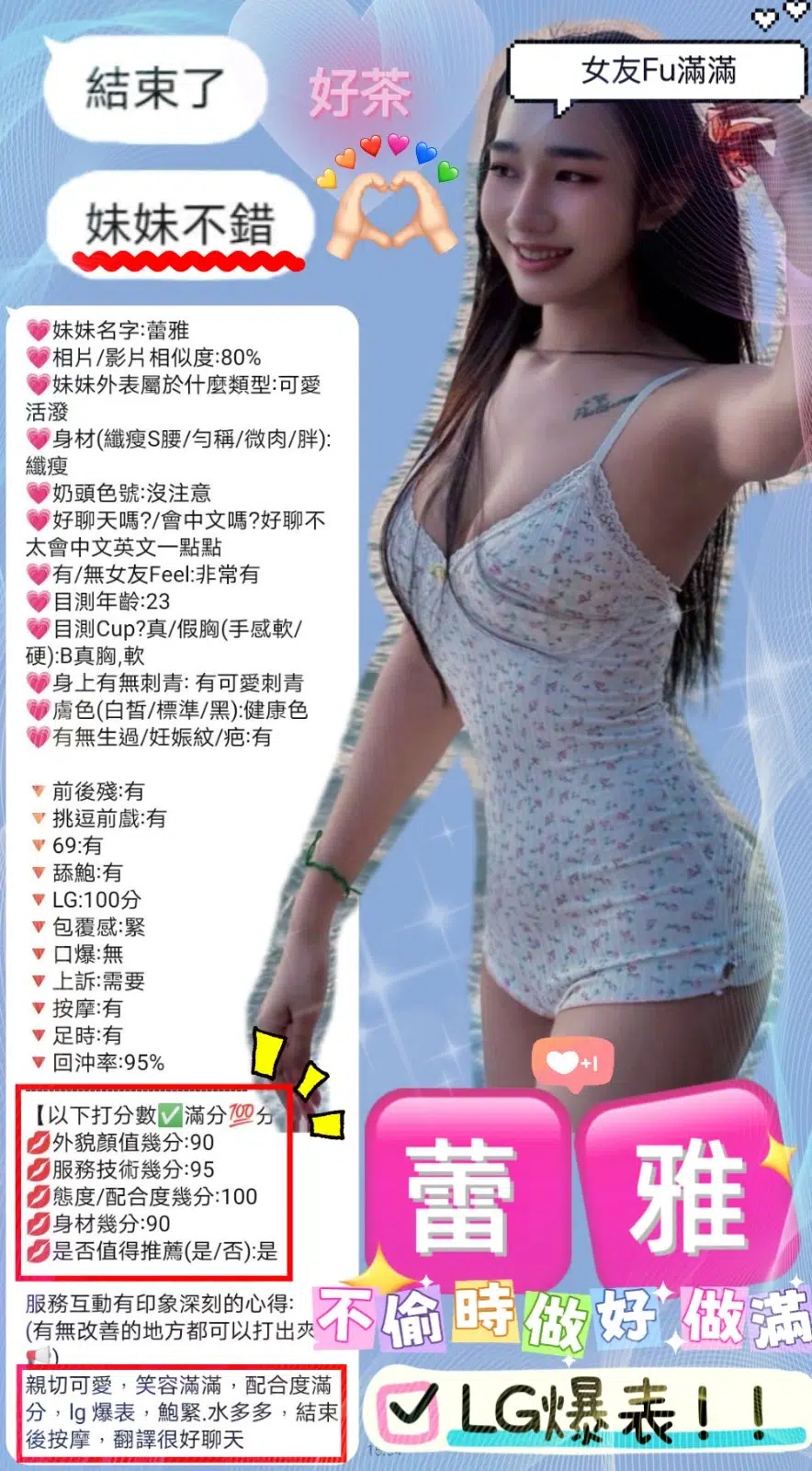 奶砲,按摩,共浴,LG(舌吻)依氣氛衛生而定,可親嘴,無套吹,品鮑,舔蛋,奶推,冰火,顏射,浴中蕭,絲襪,無套做,快餐,2S,NS