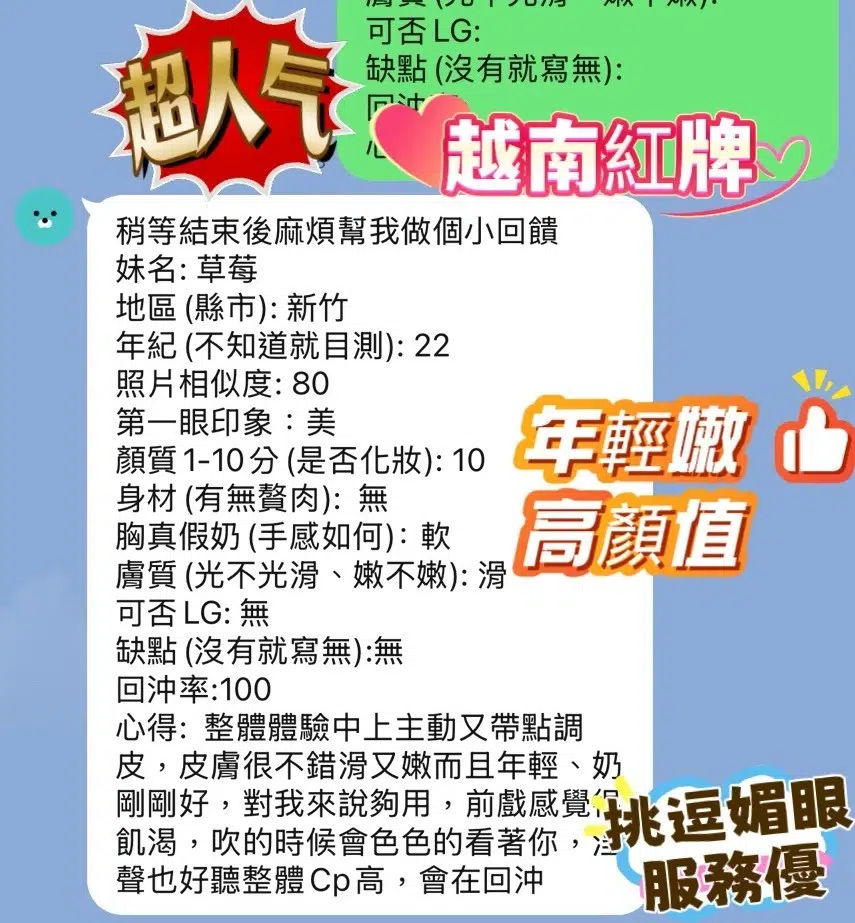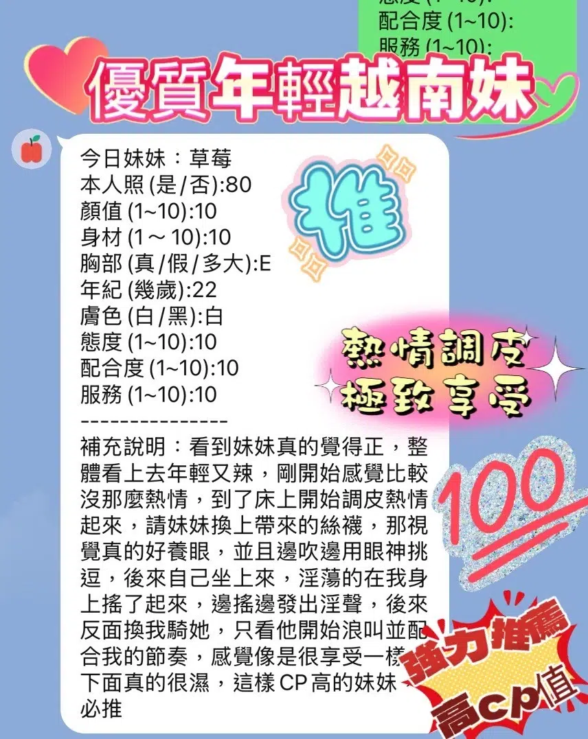 奶砲,按摩,共浴,可親嘴,無套吹,口爆,舔蛋,奶推,顏射,浴中蕭,深喉嚨,變裝(自備免付),絲襪(自備免付),快餐,2S,包夜