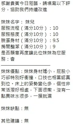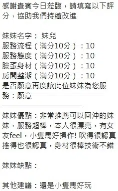 奶砲,按摩,69,共浴,LG(舌吻)依氣氛衛生而定,可親嘴,無套吹,品鮑,舔蛋,奶推,屁推,水床浴,變裝(自備免付),絲襪(自備免付),快餐,2S