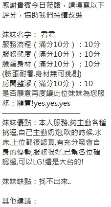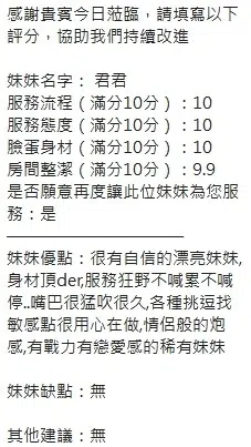奶砲,按摩,69,共浴,LG(舌吻)依氣氛衛生而定,可親嘴,無套吹,品鮑,舔蛋,奶推,屁推,顏射,水床浴,變裝(自備免付),絲襪(自備免付),無套做,無套內射,快餐,2S
