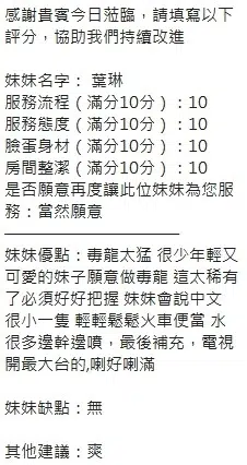 奶砲,毒龍,按摩,69,共浴,LG(舌吻)依氣氛衛生而定,可親嘴,無套吹,口爆,品鮑,舔蛋,奶推,屁推,顏射,水床浴,變裝(自備免付),絲襪(自備免付),中文溝通,快餐,2S
