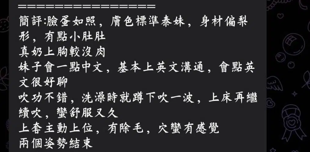 按摩,69,殘廢澡,LG(舌吻)依氣氛衛生而定,可親嘴,無套吹,口爆,品鮑,舔蛋,奶推,浴中蕭,無套做,無套內射,快餐,2S