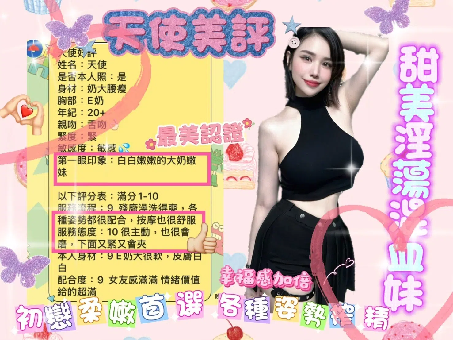 按摩,共浴,殘廢澡,可親嘴,無套吹,口爆,品鮑,輕功,浴中蕭,深喉嚨,變裝,絲襪(自備免付),玩具(按摩棒),玩具(跳蛋),情趣用品(客自備),快餐,2S