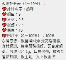 奶砲,按摩,69,陪洗,共浴,LG(舌吻)依氣氛衛生而定,可親嘴,無套吹,口爆,品鮑,舔蛋,奶推,屁推,冰火,冰塊(客自備),絲襪,快餐,2S